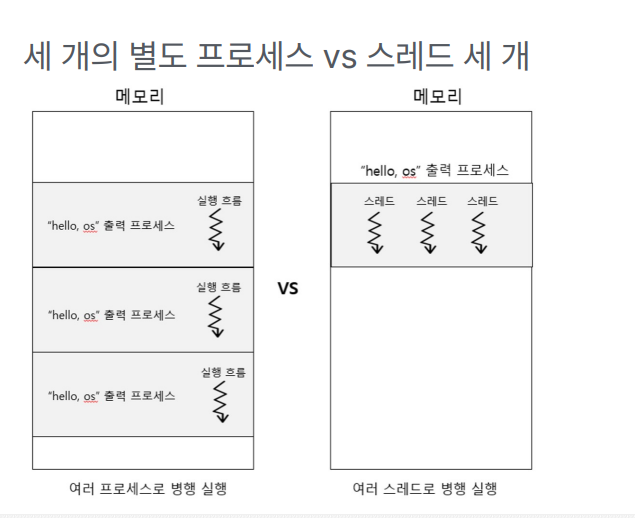 Process간에는 기본적으로 자원을 공유 X, thread는 프로세스 자원을 공유. => 메모리 효율적일 수 있음.