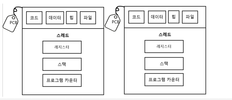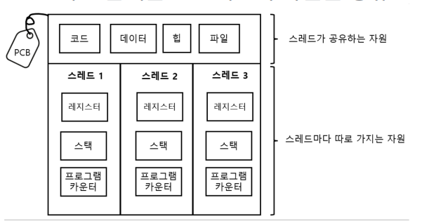 동일한 자원은 모두 공유하고, 개별의 Thread들만 각각의 register stack programm counter를 가지는 것이다.