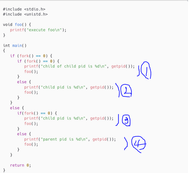 | parent pid is 5000 excute foo child pid is 5002 excute foo child pid is 5001 excute foo child of child pid is 5003 excute foo |
